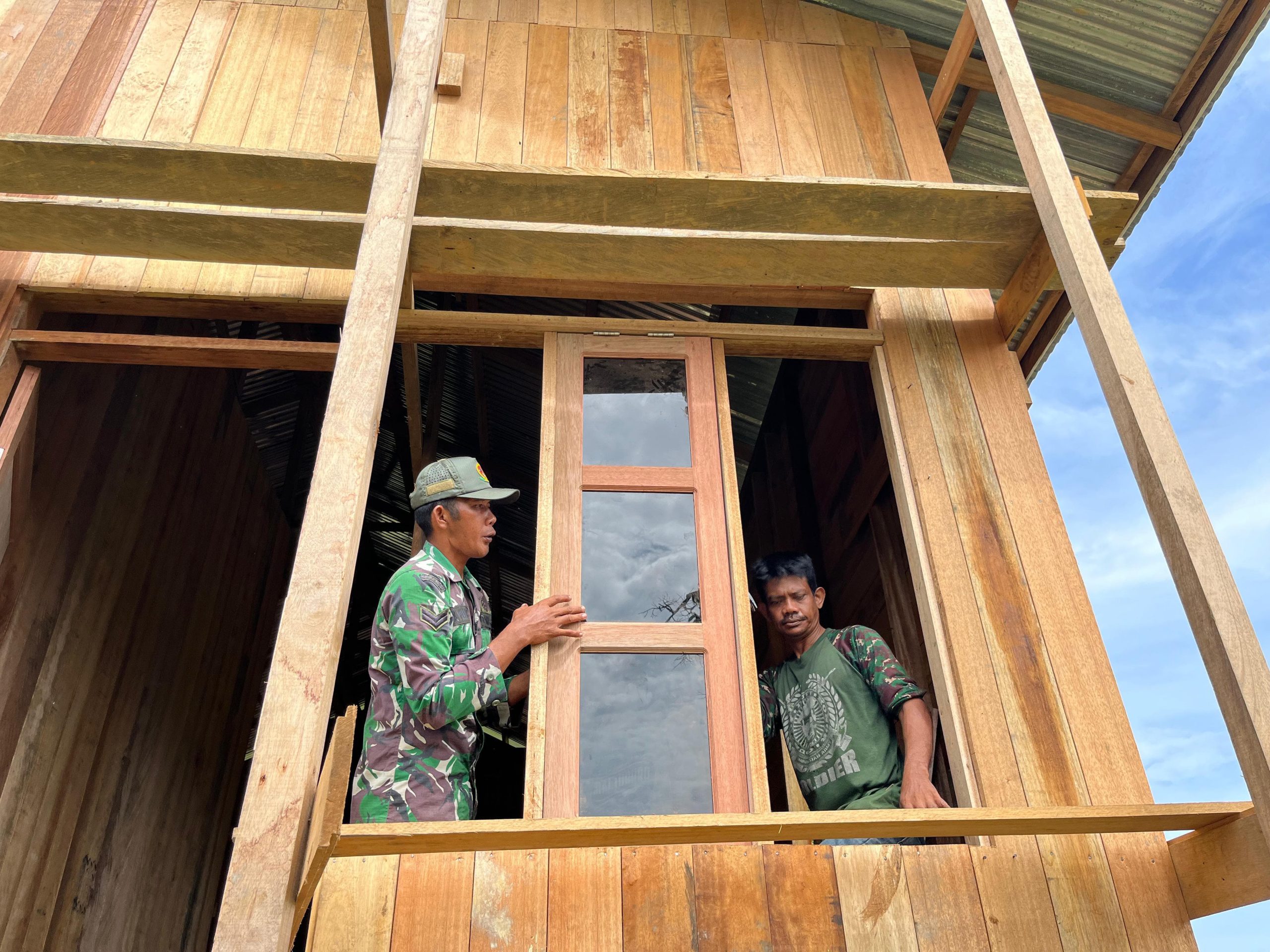 Renovasi Rumah Tidak Layak Huni (RTLH) milik bapak Jimmy warga desa Sebidai, Kelurahan Sesayap, Tana Tidung sudah hampir selesai. Satgas TNI Manunggal Membangun Desa (TMMD) Kodim 0914/TNT terus mengebut pekerjaan ini. Terpantau anggota Satgas TMMD reg 122 sedang memasang jendela.