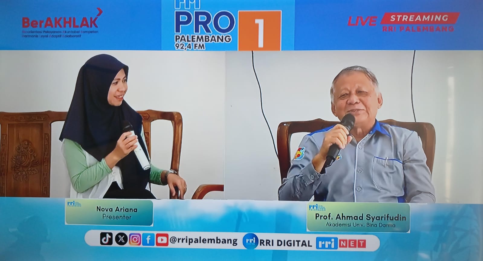 PALEMBANG, MEDIASRIWIJAYA – Prof. Dr. Ir. Achmad Syarifudin, M.Sc, PU-SDA, guru besar Universitas Bina Darma yang memiliki keahlian dalam bidang Teknik Sipil dan Lingkungan. menjadi narasumber dalam dialog yang digelar RRI Palembang. Program Dialog Tanggap Bencana dengan tema “Melestarikan Fungsi Sungai dan Hutan untuk Mencegah Banjir yang digelar RRI ini diadakan dari pukul 10.00 hingga 11.00 WIB di Hutan Kita Institute (HaKI), berlokasi di Jl. Tanjung Aur 3, Bukit Baru, Kecamatan Ilir Barat, Palembang.