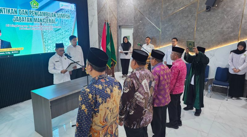 PALEMBANG, MEDIASRIWIJAYA – Kepala Kantor Wilayah Kementerian Agama Provinsi Sumatera Selatan, Syafitri Irwan, secara resmi melantik dan mengambil sumpah jabatan empat Pejabat Administrator di lingkungan Kanwil Kemenag Sumsel. Acara pelantikan ini berlangsung khidmat di Aula Kanwil pada Senin (27/4/2026) siang. Hadir pada acara pelantikan antara lain Kepala Bagian Tata Usaha Taufiq, para Kepala Bidang dan Pembimas Kanwil, Kakankemenag Kabupaten/Kota se-Sumsel, serta Ketua DWP Kanwil Kemenag Sumsel Emilia Syafitri Irwan dan pengurus.