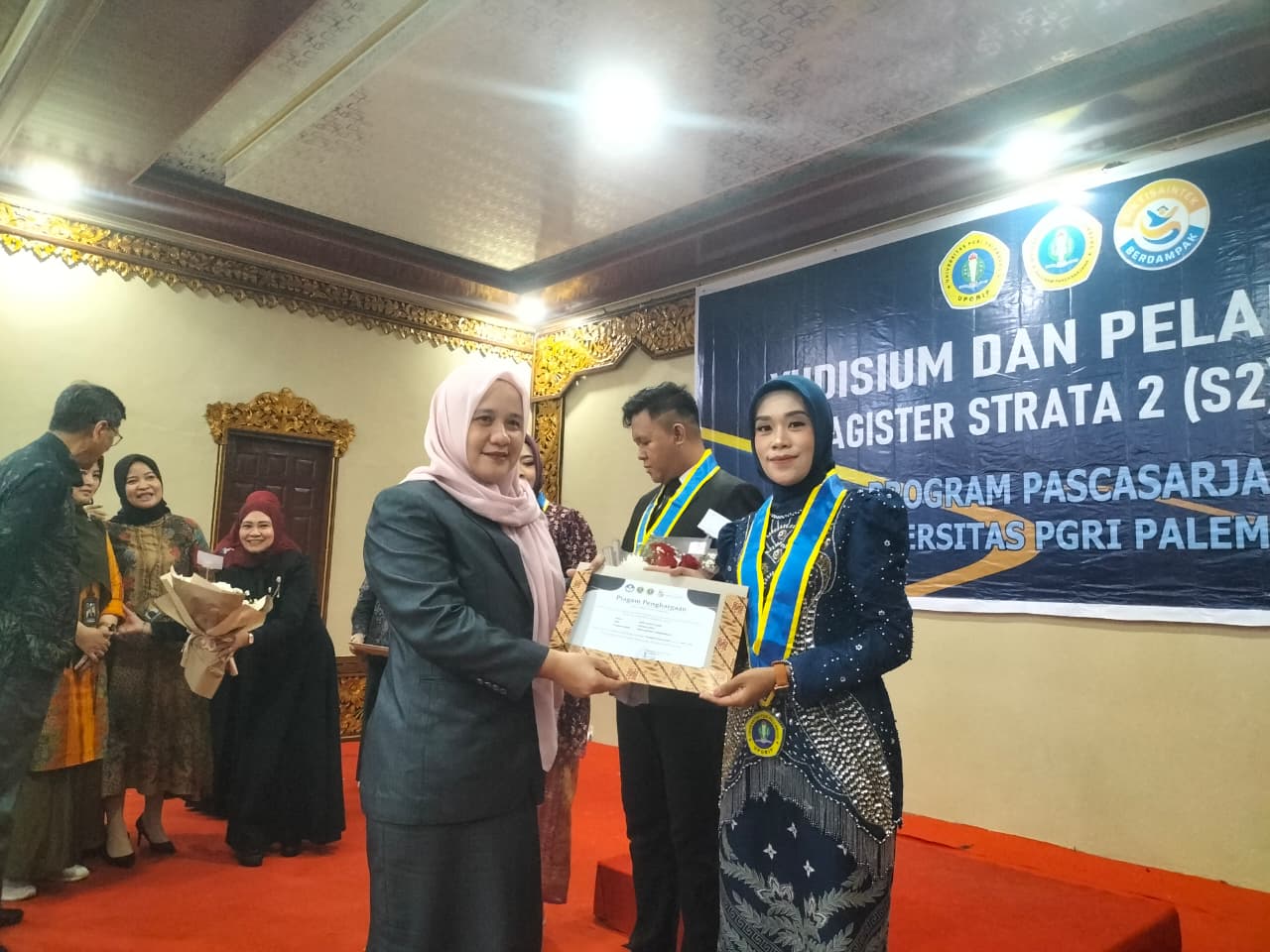 Teks foto: Plt. Direktur Pascasarjana UPGRIP, Dr. Reva Maria Valianti, SE., M.Pd., M.M saat menyerahkan penghargaan kepada lulusan terbaik.