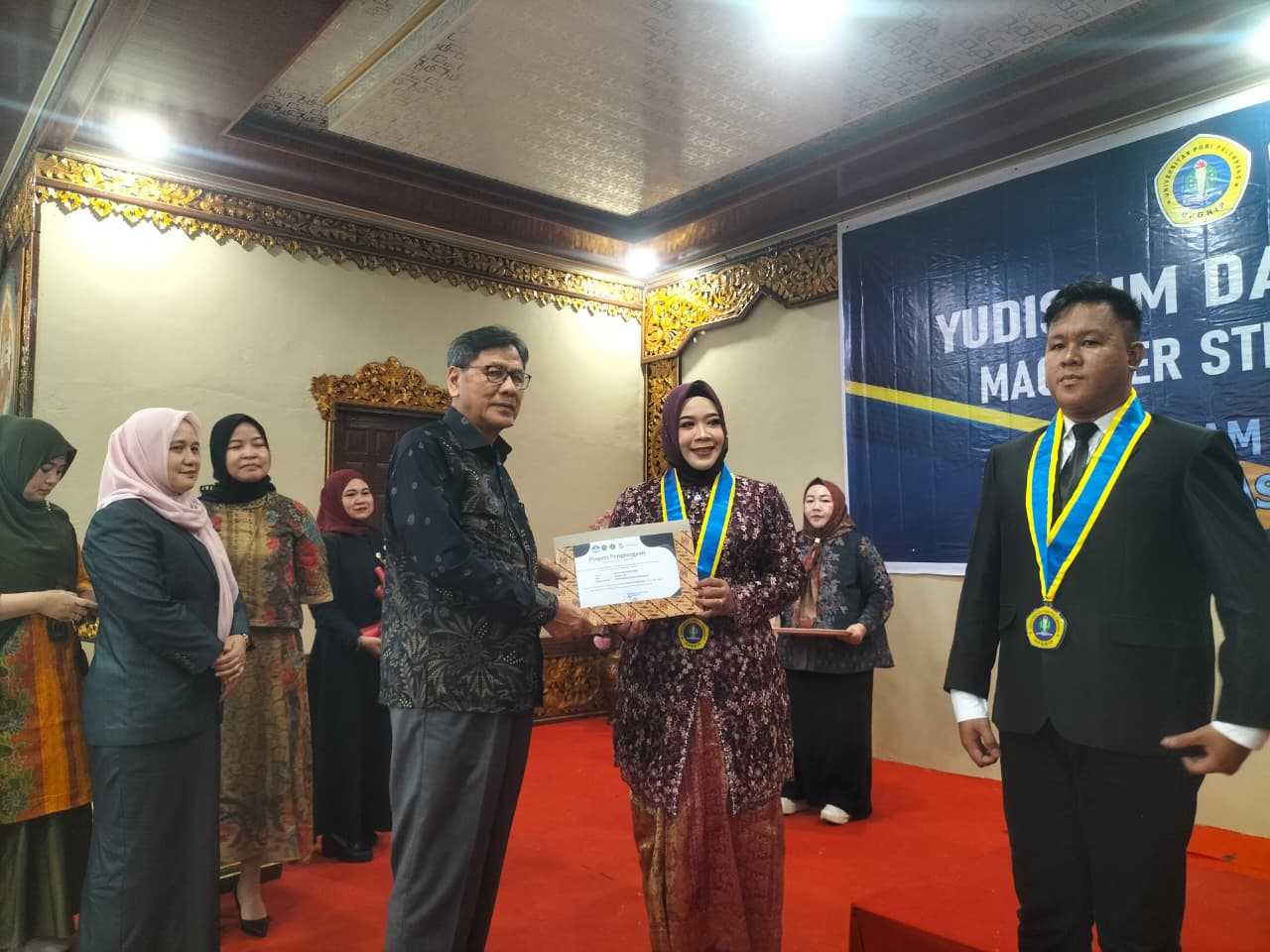 Teks foto: Kaprodi Magister Manajemen Pendidikan PPs UPGRIP, Dr. Hj. Ir. Tri Widyatsih, M.Si. saat menyerahkan sertifikat penghargaan kepada lulusan terbaik.