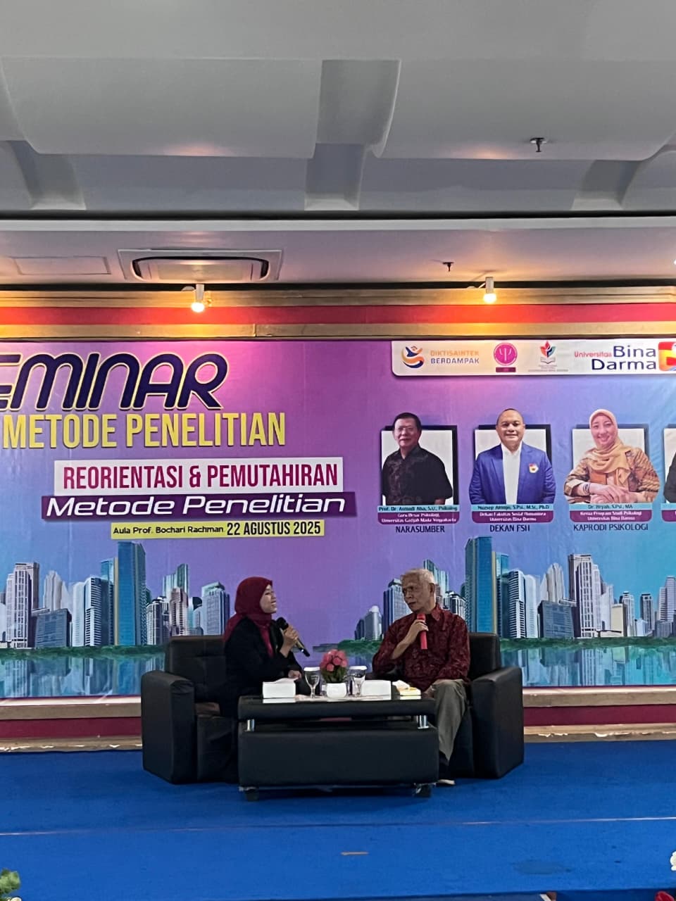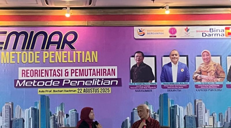 PALEMBANG, MEDIASRIWIJAYA — Universitas Bina Darma (UBD) melalui Program Studi Psikologi menyelenggarakan Seminar Metode Penelitian bertema “Reorientasi & Pemutakhiran Metode Penelitian” di Aula Prof. Bochari Rachman, Kampus B UBD, serta diikuti secara daring melalui zoom.