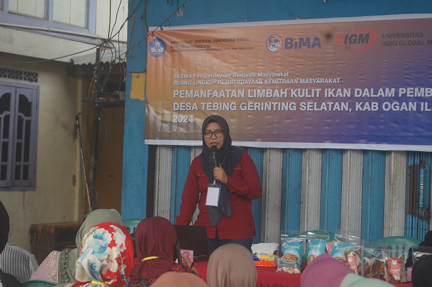 INDRALAYA,MEDIASRIWIJAYA – Tim Universitas Indo Global Mandiri (IGM) menggelar pengabdian kepada masyarakat (PKM) di Desa Tebing Gerinting Selatan, Kabupaten Ogan Ilir. Dalam skema Pemberdayaan Berbasis Masyarakat (PBM) tersebut, para dosen dosen profesional di bidangnya merangkul masyarakat setempat untuk memaksimalkan dan memanfaatkan limbah kulit ikan sehingga memiliki nilai ekonomis yang tinggi.