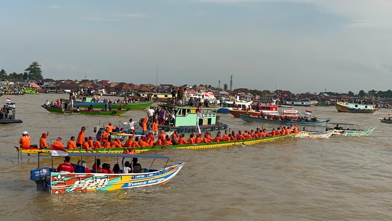 Kemeriahan Para Pendayung dan Suporter dalam memeriahkan festival Perahu Bidar Tradisional Palembang. Foto:Diah