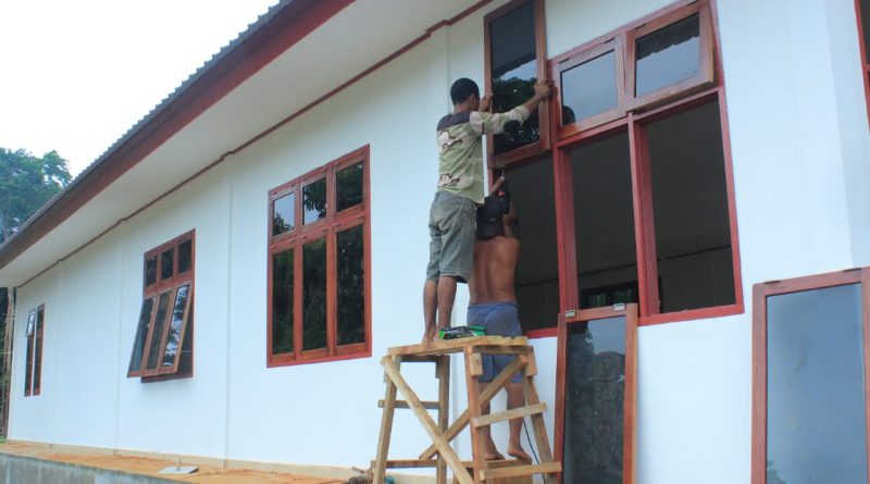 SARMI – Program TNI Manunggal Membangun Desa (TMMD) ke-123 Kodim 1712/Sarmi semakin mendekati tahap akhir, personel Satgas TMMD bekerja dengan penuh semangat menyelesaikan pemasangan daun jendela pada bangunan gereja dan rumah pastori di Kp. Podena Distrik Bonggo Kab. Sarmi, Papua. Senin (17/3/2025).