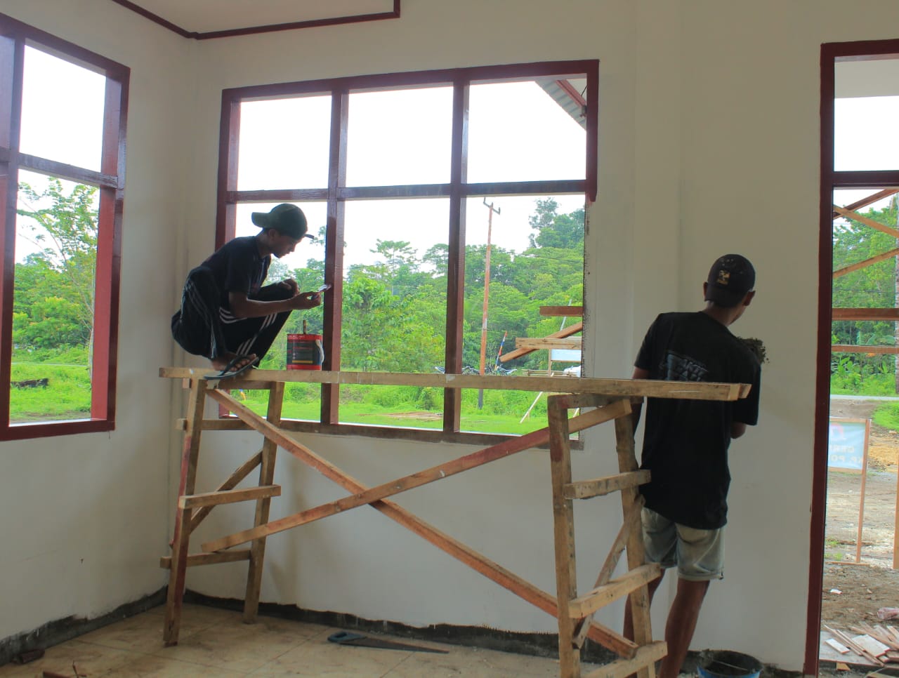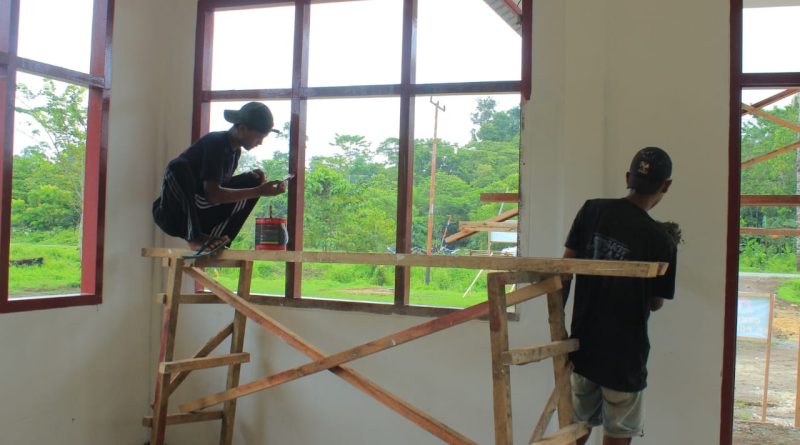 Satgas TMMD 123 Kodim 1712/Sarmi dan Warga Gotong Royong Cat Kusen Pintu Gereja