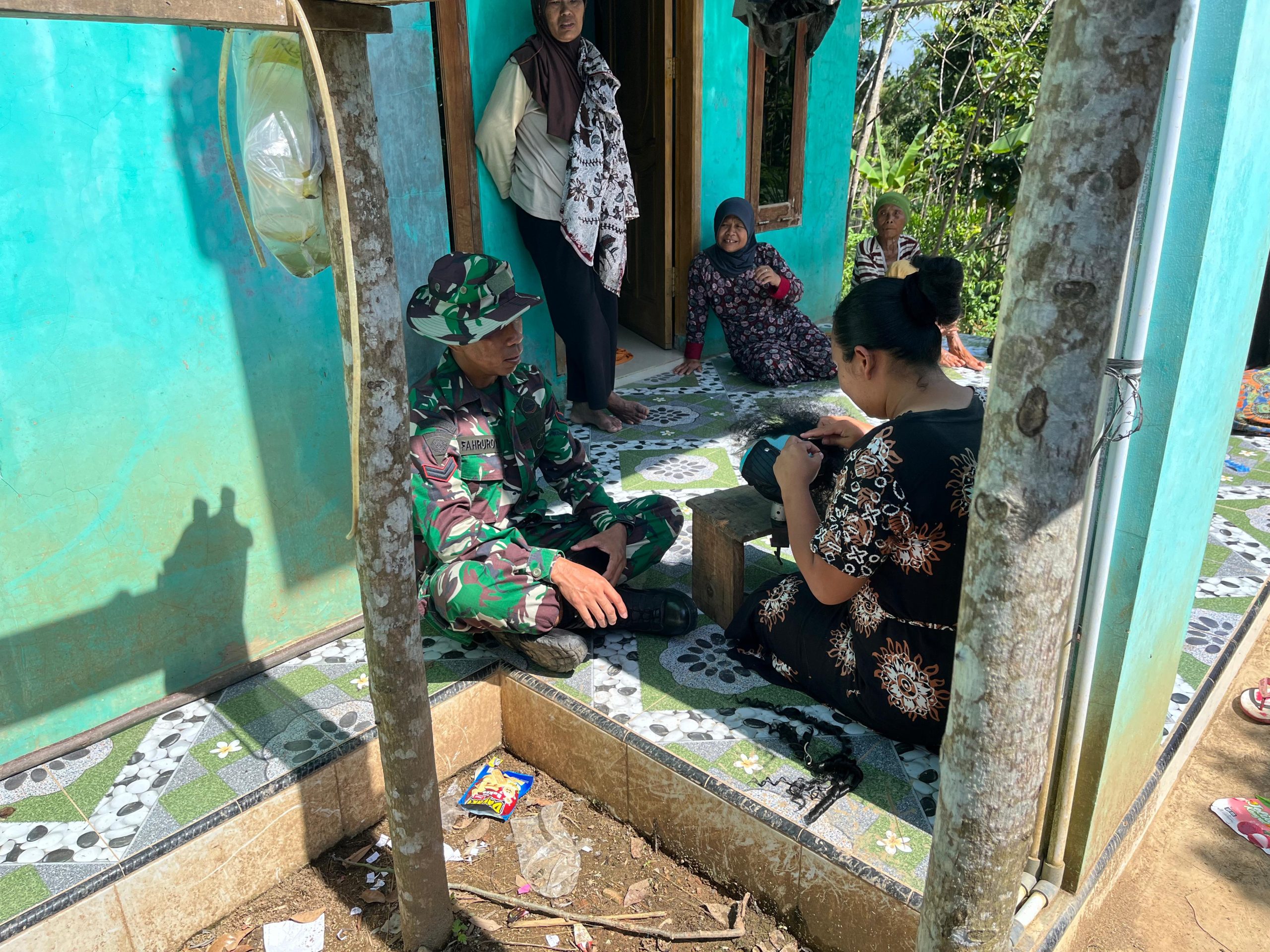 Seperti halnya yang dilakukan oleh Sertu Fahruroyi, yang kegiatan sehari-harinya dalam bertugas dimanapun selalu berinteraksi dengan masyarakat. Terlebih kali ini, kami berinteraksi dan berkomunikasi sosial di rumah ibu Elik, yang kebetulan ibu-ibu tetangga juga sedang berkumpul di rumahnya.