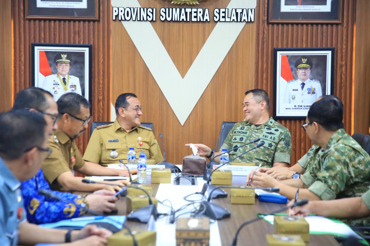 PALEMBANG,MEDIASRIWIJAYA — Sekretaris Daerah Provinsi Sumatera Selatan, Dr. Drs. H. Edward Candra, M.H., menerima audiensi Perwira Staf Ahli Tingkat III Bidang Politik dan Keamanan Nasional Panglima TNI, Mayjen TNI Budi Hariswanto, bersama tim dalam rangka pengumpulan data untuk penyusunan kajian strategi penyelesaian konflik tenurial pertahanan. Pertemuan tersebut berlangsung di Ruang Rapat Setda Provinsi Sumsel, Selasa (21/04/2026).