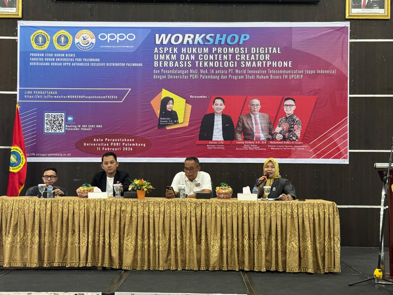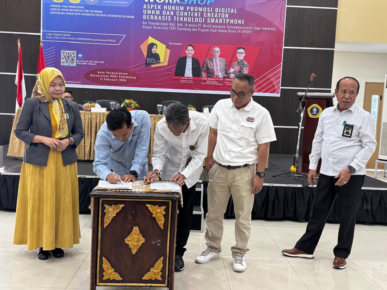 PALEMBANG, MEDIASRIWIJAYA – Era digital menuntut para pelaku UMKM dan content creator untuk lebih melek hukum guna menghindari jerat sengketa di dunia maya. Menjawab tantangan tersebut, Fakultas Hukum (FH) Universitas PGRI Palembang (UPGRIP) menggelar Workshop bertajuk “Aspek Hukum Promosi Digital UMKM dan Content Creator Berbasis Teknologi Smartphone” pada Rabu, 11 Februari 2026.Acara yang berlangsung khidmat di Aula Perpustakaan Universitas PGRI Palembang ini tidak hanya sekadar edukasi, tetapi juga menjadi momentum bersejarah melalui penandatanganan nota kesepahaman yang luas antara dunia pendidikan dan industri teknologi.