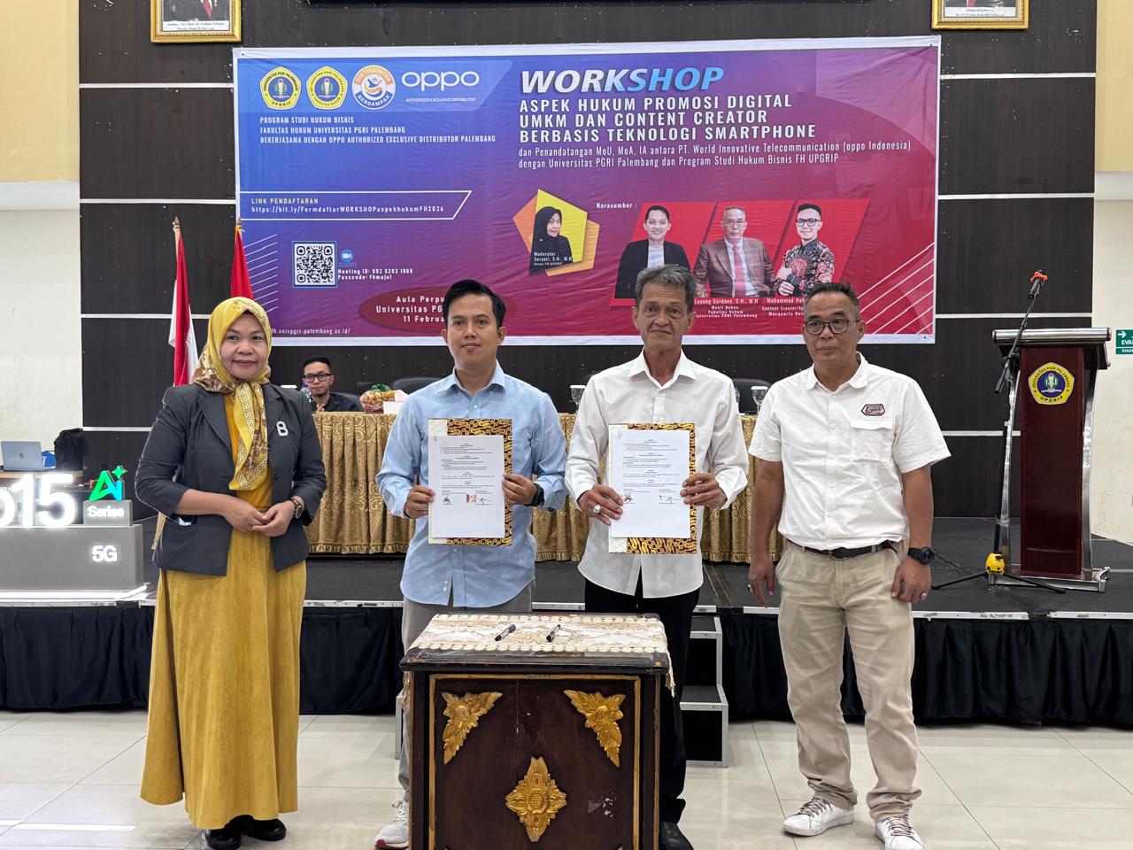 Kegiatan ini ditandai dengan penandatanganan Memorandum of Understanding (MoU), Memorandum of Agreement (MoA), dan Implementation Agreement (IA) antara PT World Innovative Telecommunication (OPPO Indonesia) dengan Universitas PGRI Palembang serta Program Studi Hukum Bisnis FH UPGRIP.