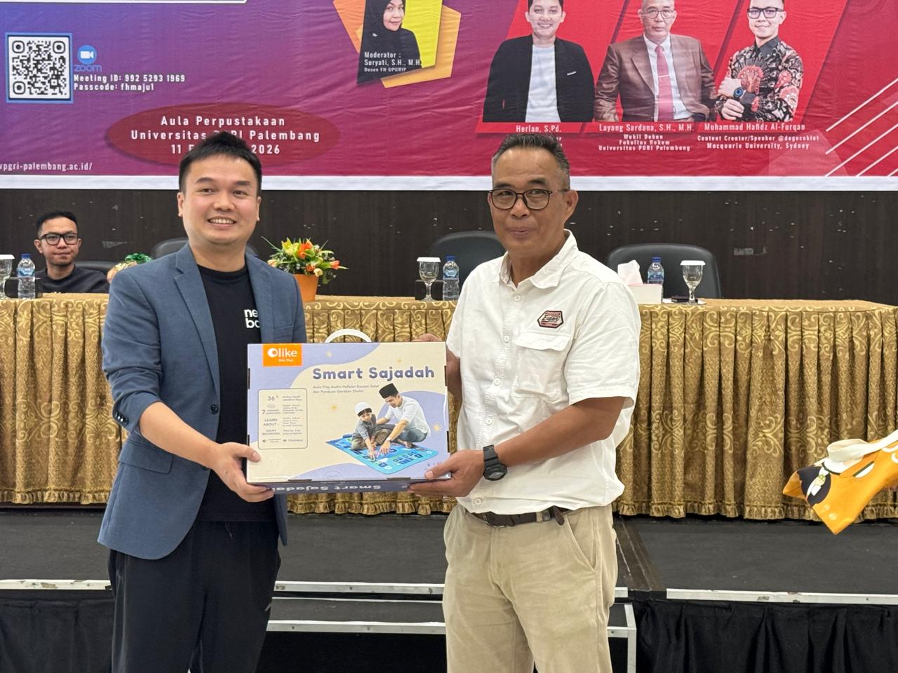 Teks foto: Wakil Dekan Fakultas Hukum Universitas PGRI Palembang, Layang Sardana, S.H.,M.H., (kanan) bersama cenderamata dari Oppo.
