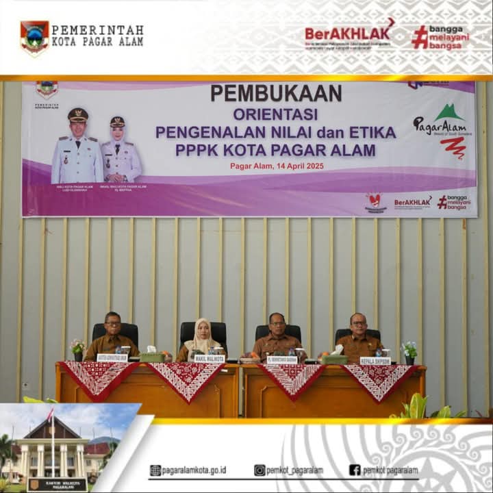 PAGARALAM,MEDIASRIWIJAYA – Wakil Walikota Pagar Alam, Hj. Bertha membuka Kegiatan Orientasi Pengenalan Nilai dan Etika kepada Pegawai Pemerintah dengan Perjanjian Kerja (PPPK) Kota Pagar Alam, bertempat di Gedung Serbaguna SD Negeri 74, Gunung Gare, Kota Pagar Alam, Senin (14/04/2025).